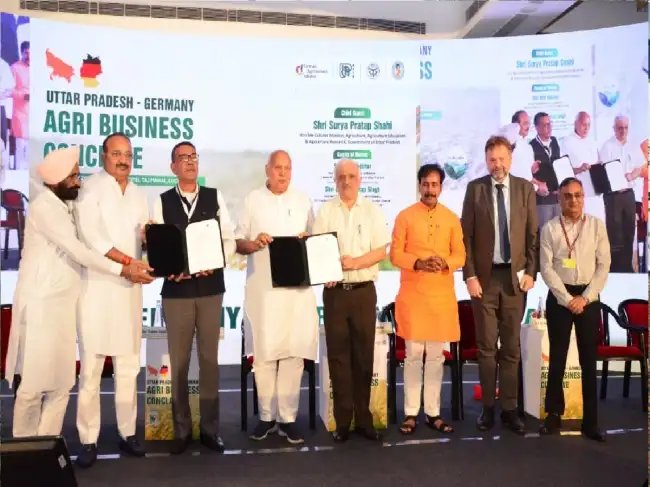 ֆ:§ֆ:§ֆ:§ֆ:§ֆ:§उत्तर प्रदेश में कृषि उत्पादकता, उत्पादन और किसानों की आय बढ़ाने के उद्देश्य से लखनऊ में उत्तर प्रदेश-जर्मनी कृषि व्यवसाय सम्मेलन का आयोजन किया गया। इस सम्मेलन में जर्मन एग्रीबिजनेस एलायंस जीएए और यूपीडीएएसपी उत्तर प्रदेश सरकार के बीच एमओयू पर हस्ताक्षर किए गए। कृषि मंत्री सूर्य प्रताप शाही ने कहा कि प्रधानमंत्री डिजिटल कृषि पर जोर दे रहे हैं। योगी सरकार किसानों के हितों की रक्षा के लिए पूरी तरह प्रतिबद्ध है। डिजिटल कृषि को बढ़ाने के लिए योगी कैबिनेट ने एग्रीटेक नीति-2024 लाने पर सहमति दे दी है। उन्होंने कहा कि उत्तर प्रदेश में खाद्यान्न उत्पादन में लगातार वृद्धि हो रही है। दूध उत्पादन और गन्ना खेती में राज्य सर्वोच्च स्थान रखता है।कृषि निर्यात में उत्तर प्रदेश तीसरे स्थान पर है। 120 मंडियों को ई-मंडी से जोड़ा गया है। कृषि में डिजिटल को बढ़ावा देते हुए कृषि का डिजिटल सर्वेक्षण किया जा रहा है। इसके साथ ही किसानों के बैंक खातों में सीधे सब्सिडी की रकम भेजी जा रही है। इसके अलावा आर्टिफिशियल इंटेलिजेंस का प्रयोग कर प्रदेश की कृषि को नए आयामों तक ले जाने का कार्य किया जा रहा है।