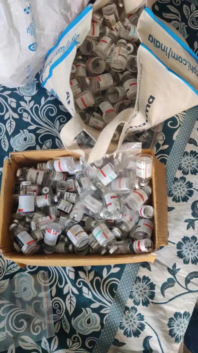 §֍:कैंसर की नकली दवाओं की 137 शीशियां बरामद§ֆ:वहीं, जब पुलिस की टीम साउथ सिटी गुड़गांव पहुंची तो वहां एक फ्लैट के अंदर से नीरज चौहान को पुलिस ने बड़ी मात्रा में कैंसर की नकली दवाओं के इंजेक्शन और शीशियों के साथ गिरफ्तार किया. पुलिस ने छापेमारी के दौरान उसके पास से कैंसर की नकली दवा के 137 इंजेक्शन बरामद किए, जो कई नामी-गिरामी ब्रांड्स Keytruda, Infinzi, Tecentriq, Perjeta, Opdyta, Darzalex & Erbitux की शीशियों में थे. इसके अलावा पुलिस ने Keytruda, Infinzi, Tecentriq, Perjeta, Opdyta, Darzalex & Phesgo ब्रांड्स की 519 खाली शीशी बरामद की है. पुलिस ने 864 खाली पैकेजिंग बॉक्स भी बरामद किए हैं. नीरज चौहान से पूछताछ के बाद पुलिस ने उसके चचेरे भाई तुषार चौहान को भी गिरफ्तार कियाहै. तुषार चौहान इस सप्लाई चेन का हिस्सा था.