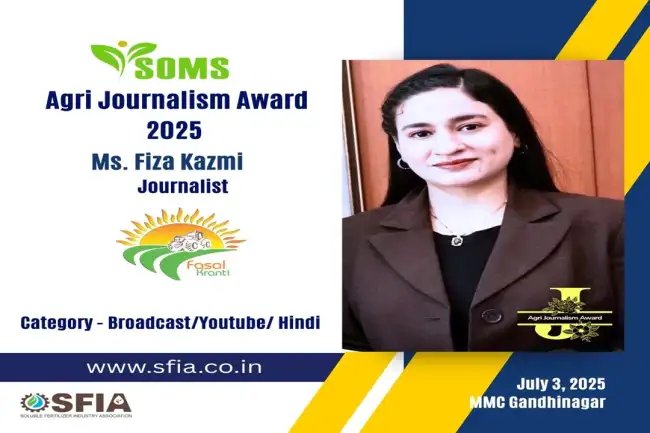 भारत की अग्रणी कृषि मीडिया संस्था फ़सल क्रांति की साहसी पत्रकार और एंकर फिज़ा काज़मी को सॉल्युबल फर्टिलाइज़र इंडस्ट्री एसोसिएशन (SFIA) द्वारा आयोजित एग्री जर्नलिज़्म अवॉर्ड – ब्रॉडकास्ट कैटेगरी में नामित किया गया है। यह सम्मान उन पत्रकारों को दिया जाता है जिन्होंने कृषि और किसानों से जुड़े मुद्दों को प्रभावी ढंग से उजागर कर समाज में बदलाव की दिशा में योगदान दिया है।
