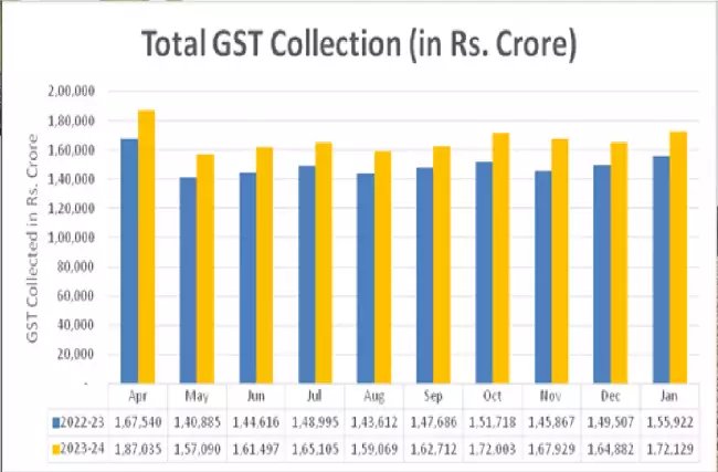 §ֆ:चार्ट चालू वर्ष के दौरान मासिक सकल जीएसटी राजस्व में रुझान को दर्शाता है। यह डेटा शाम 05:00 बजे (यानी 31 जनवरी 2024) तक का है। महीने का अंतिम संग्रह अधिक होगा।