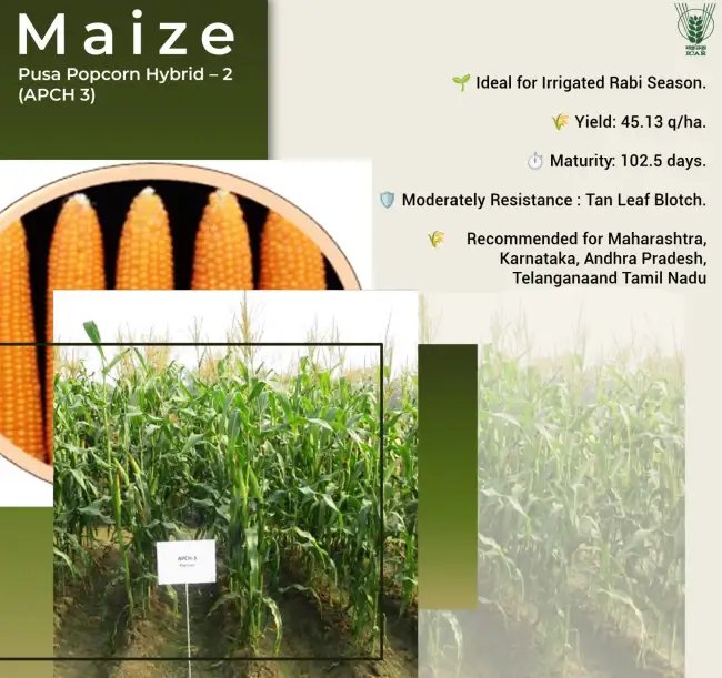 §֍:महाराष्ट्र समेत इन राज्यों के लिए उत्तम §ֆ:मक्का की पूसा पॉपकॉर्न हाइब्रिड-2 (एपीसीएच 3) किस्म भारतीय कृषि अनुसंधान परिषद (ICAR) के रिसर्च संस्थान (IARI) ने विकसित किया है. आईसीएआर ने रबी सीजन में इस किस्म की बुवाई करने की सलाह किसानों को दी है. यह मक्का किस्म महाराष्ट्र, कर्नाटक, आंध्र प्रदेश, तेलंगाना और तमिलनाडु के क्षेत्रों के लिए विकसित की गई है. यहां की जलवायु में यह किस्म कम लागत में किसानों को बंपर पैदावार देगी.