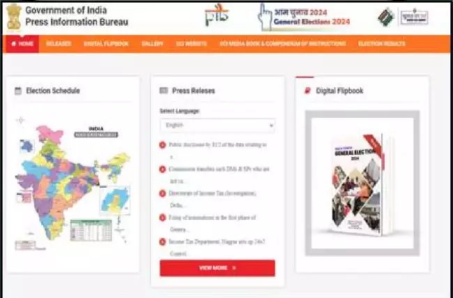 §पत्र सूचना कार्यालय ने आम चुनाव 2024 की रिपोर्टिंग करने वाले मीडियाकर्मियों के लिए समग्र सुविधा पोर्टल के रूप में विभिन्न विशेषताओं से लैस एक माइक्रोसाइट https://pib.gov.in/elect2024/index.aspx की शुरुआत की है। इस पोर्टल में निम्नलिखित विशेषताएं हैं। एक डिजिटल फ्लिप बुक: इसमें विभिन्न दिलचस्प विश्लेषण और डेटा पर आधारित फीचरों का समावेश है।