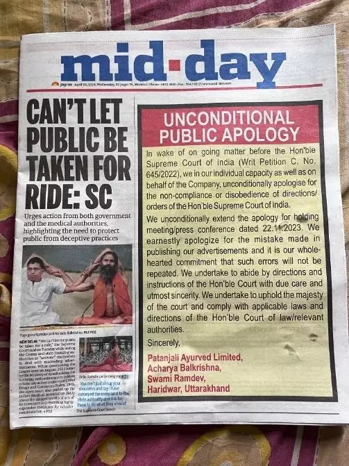 §ֆ:पतंजलि ने ‘बिना शर्त सार्वजनिक माफी’ के नाम से अखबारों में बड़े आकार में माफीनामा छपवाया है. इसमें लिखा है, ‘भारत के माननीय सर्वोच्च न्यायालय में विचाराधीन प्रकरण के संदर्भ में माननीय सर्वोच्च न्यायलय के निर्देशों/ आदेशों का पालन न करने अथवा अवज्ञा के लिए हम व्यक्तिगत रूप से, साथ ही कंपनी की ओर से बिना शर्त क्षमायाची हैं.
