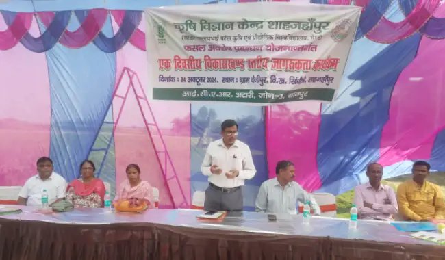 ֍:कृषि वैज्ञानिकों ने दी जानकारी§ֆ:इस अवसर पर डॉ. एन. सी. त्रिपाठी ने किसानों को फसल अवशेष प्रबंधन के बारे में जानकारी देते हुए बताया कि फसल अवशिष्ट मिट्टी में मिलने से कार्बनिक पदार्थ व अन्य तत्व बढ़ते हैं जिससे सूक्ष्म जीवों की सक्रियता बढ़ जाती है मृदा का पीएच मान ठीक रहता है जिससे उर्वरकों की उपलब्धता अधिक समय तक रहता है। भूमि संरक्षण अधिकारी श्री आर.पी. राणा जी ने अंगीकृत ग्राम में कृषि विभाग द्वारा आयोजित किए जाने वाले विभिन्न कार्यक्रम को एवं फसल अवशिष्ट प्रबंधन परियोजना के लाभ एवं फसल अवशिष्ट जलाने से हानिकारक गैसो के बारे में जानकारी दी. प्रभारी राजकीय बीज भण्डार भावलखेड़ा ने प्रधानमंत्री किसान सम्मान योजना के बारे में किसानों को जागरूक किया एवं उनकी समस्याओं का समाधान किया. नोडल अधिकारी डॉक्टर एन पी गुप्ता ने उन्नत कृषि यंत्रों द्वारा फसल अवशेष प्रबंधन परियोजना तथा बायो डी कंपोजर के बारे में विस्तार से जानकारी दी. डॉ महेश कुमार ने अंगीकृत ग्राम में सब्जियों की खेती को बढ़ावा देने के लिए विभिन्न सब्जियों की खेती एवं कीड़े एवं बीमारियों के बारे में चर्चा की। डॉ विमल कुमार ने फसलों में लगने वाले विभिन्न कीड़े बीमारियों तथा गेहूं की उन्नत प्रजातियों के बारे में जानकारी दी.§۩:Uploads/NewsImages/26-10-2024/bdpcZuXMti1xFsKjJfEj.jpg|§देशभर में किसानों को नई तकनीकों से अवगत कराने के लिए कृषि विभाग कई कार्यक्रम आयोजित करते रहते हैं. इसी क्रम में कृषि उत्पादन आयुक्त उत्तर प्रदेश सरकार के निर्देशानुसार कृषि विज्ञान केंद्र द्वारा भावलखेड़ा में आज फसल अवशेष प्रबंधन जागरूकता कार्यक्रम का आयोजन किया गया. इस कार्यक्रम में कृषि विज्ञान केंद्र के प्रभारी अधिकारी डॉ एनसी त्रिपाठी फसल अवशेष प्रबंधन परियोजना के नोडल अधिकारी डॉक्टर एन.पी गुप्ता, डॉक्टर महेश कुमार डॉक्टर विमल कुमार कृषि विभाग के भूमि संरक्षण अधिकारी आर.पी. राणा प्रभारी राजकीय कृषि बीज भंडार भावलखेड़ा एवं अन्य कृषि विभाग के अधिकारी कर्मचारी गण तथा पूर्व प्रधान राजवीर सिंह एवं वर्तमान प्रधान सहित 110 किसानों ने इस कार्यक्रम में प्रतिभाग किया.