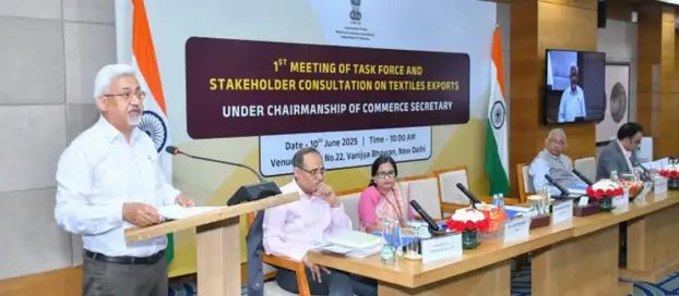 वस्त्र निर्यात को सशक्त बनाने और वैश्विक बाजार में भारत की हिस्सेदारी बढ़ाने के उद्देश्य से गठित टास्क फोर्स ऑन टेक्सटाइल्स एक्सपोर्ट्स की पहली बैठक 10 जून 2025 को वाणिज्य भवन, नई दिल्ली में आयोजित की गई। इस बैठक की अध्यक्षता वाणिज्य सचिव श्री सुनील बार्थवाल ने की।बैठक में वस्त्र क्षेत्र की संपूर्ण मूल्य श्रृंखला (Value Chain) से जुड़े विविध मुद्दों पर चर्चा की गई। इसका मुख्य उद्देश्य सभी संबंधित हितधारकों को एक साझा मंच पर लाकर, वस्त्र निर्यात क्षेत्र की प्रमुख चुनौतियों का समाधान खोजना और निर्यात बढ़ाने के लिए ठोस रणनीतियाँ बनाना है।