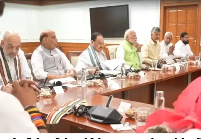 ֆ:एनडीए की इस बैठक में सभी सहयोगी दल के प्रमुख पहुंचे. बैठक की जो फोटो सामने आई है उसमें पीएम मोदी के दाएं ओर नड्डा के बाद राजनाथ सिंह और फिर अमित शाह बैठे नजर आ रहे हैं. वहीं बाएं ओर चंद्रबाबू नायडू के बाद नीतीश कुमार और फिर शिवसेना शिंदे गुट के प्रमुख एक नाथ शिंदे बैठे नजर आए.