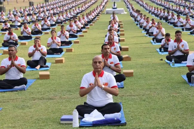 ֆ:§ֆ:§ֆ:§ֆ:§ֆ:§रक्षा मंत्री श्री राजनाथ सिंह ने 21 जून, 2024 को उत्तर प्रदेश के मथुरा में 1 कोर में सैनिकों के साथ विभिन्न आसन और श्वास अभ्यास करके 10वें अंतर्राष्ट्रीय योग दिवस को मनाने में सशस्त्र बलों का नेतृत्व किया। इस कार्यक्रम में सेनाध्यक्ष जनरल मनोज पांडे और 1 कोर के जनरल ऑफिसर कमांडिंग लेफ्टिनेंट जनरल संजय मित्रा के साथ वरिष्ठ अधिकारियों, अग्निवीरों, परिवारों और बच्चों सहित 600 लोग शामिल हुए।इस अवसर पर बोलते हुए रक्षा मंत्री ने इस दिन को राष्ट्र के लिए गर्व का विषय बताया कि दुनिया भारत की इस महान सांस्कृतिक विरासत को उत्साह के साथ स्वीकार कर रही है और अपना रही है। उन्होंने योग को दुनिया तक पहुंचाने का श्रेय प्रधानमंत्री श्री नरेंद्र मोदी को दिया।