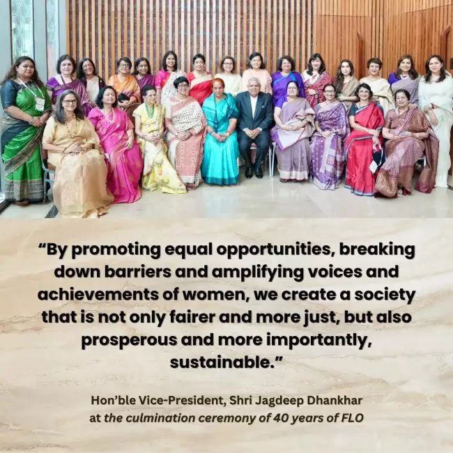 §पिछले कुछ महीनों में मुझे एफएलओ के बैंगलोर, कानपुर और जम्मू संस्थानों के गतिशील सदस्यों के साथ बातचीत करने का अवसर मिला है, मुझे उनमें से कुछ से अन्यथा भी भेंट करने का अवसर मिला है। आपके संगठन के साथ मेरा बेहद मजबूती से जुड़ाव है, 4 दशकों से भी कम समय के भीतर आपका प्रभाव असाधारण है और मुझे विश्वास है कि आप इंडिया@2047 के लिए मैराथन मार्च का एक महत्वपूर्ण हिस्सा हैं।ऐसे समय में जब देश अर्थव्यवस्था और विकास में अभूतपूर्व तेजी के साथ वृद्धि की ओर अग्रसर है, आपके संगठन में इस दिशा में योगदान करने की पर्याप्त क्षमता है।1972 तक फॉर्च्यून 500 कंपनियों में कोई भी महिला मुख्य कार्यकारी अधिकारी नहीं थी। 2023 के अंत तक, फॉर्च्यून 500 सूची में 50 से अधिक महिला सीईओ हैं। इसमें कोई संदेह नहीं कि यह एक महत्वपूर्ण उपलब्धि है, लेकिन अभी भी एक लंबा मार्ग तय करना शेष है। इस प्रतिष्ठित पद के लिए आपका दृढ़ संकल्प आर्थिक स्थिरता, सामाजिक विकास और सद्भाव के लिए आवश्यक है।लैंगिक समानता, महिला सशक्तिकरण और महिला नेतृत्व विकास से कोई असहमत नहीं हो सकता। यह न्यायसंगत समाज के लिए मौलिक हैं, ऐसा समाज जहां न्याय हो और कोई असमानता न हो। यह उत्कृष्ठ व्यवस्था के साथ समानता लाता है।संक्षेप में, महिलाओं को सशक्त बनाना हमारी दुनिया के वर्तमान और भविष्य के लिए एक निवेश है। आप परिवार के लिए निवेश कर रहे हैं, आप समाज के लिए निवेश कर रहे हैं, वस्तुतः आप संपूर्ण धरा के लिए निवेश कर रहे हैं। समान अवसरों को बढ़ावा देकर, बाधाओं को समाप्त करते हुए महिलाओं की आवाज़ और उपलब्धियों को बढ़ाकर, हम एक ऐसे समाज का निर्माण करते हैं जो न केवल निष्पक्ष और न्यायसंगत है, बल्कि समृद्ध और स्थायी भी है।