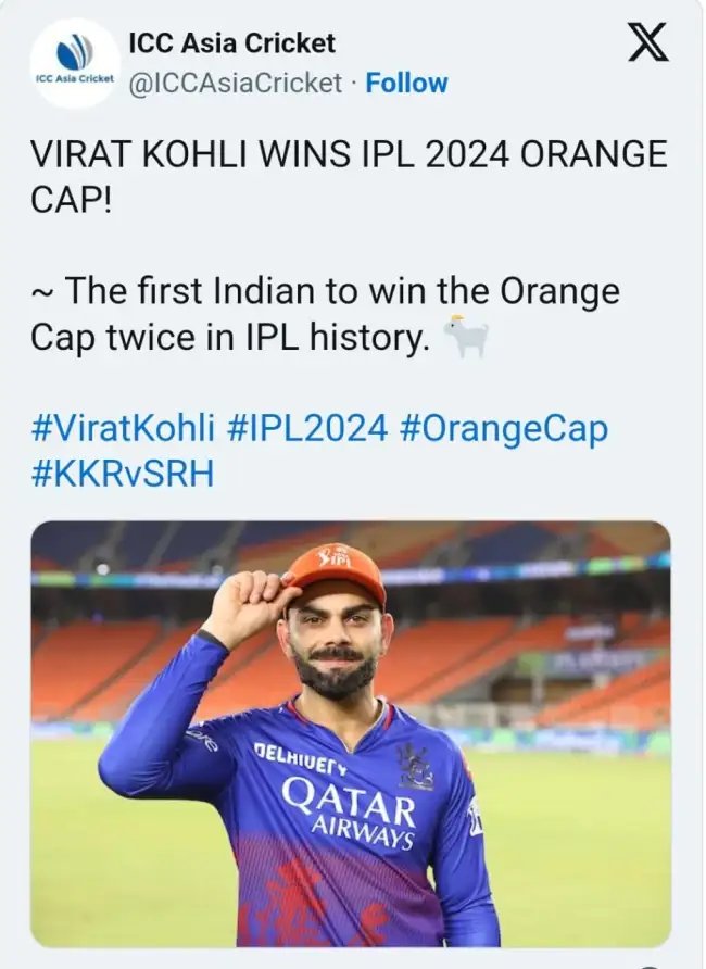 ֆ:उन्होंने 17वें सीजन में 15 मैच खेले। इस दौरान 15 पारियों में विराट कोहली ने 61.75 की औसत और 154.69 की स्ट्राइक रेट से 741 रन बनाए। आईपीएल 2024 में विराट कोहली ने पांच अर्धशतक और एक शतक लगाया । 17वें सीजन में उनका सर्वाधिक स्कोर नाबाद 113 रन रहा। इसके साथ ही विराट कोहली ने इतिहास भी रच दिया। वह आईपीएल के दो सीजन में ऑरेंज कैप जीतने वाले पहले भारतीय बल्लेबाज बन गए हैं। इससे पहले आईपीएल 2016 में भी विराट कोहली ने ऑरेंज कैप पर कब्जा जमाया था।§विराट कोहली आईपीएल 2024 में सबसे ज्यादा रन बनाने वाले बल्लेबाज हैं। इस सीजन की ऑरेंज कैप विराट कोहली के सिर पर ही सजी रहेगी।